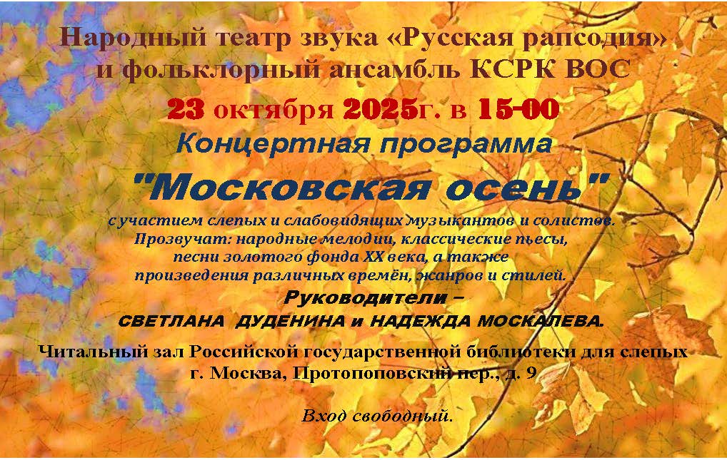 23 октября 2025 года в 15:00 в читальном зале Российской государственной библиотеки для слепых по адресу: Протопоповский переулок, дом 9, состоится концерт цикла «Московская осень» с участием слепых и слабовидящих музыкантов, солистов Народного театра звука «Русская рапсодия» КСРК ВОС (руководитель – лауреат международных и всероссийских конкурсов, заслуженный работник ВОС, доцент Российской государственной специализированной академии искусств Светлана Дуденина) и Фольклорного ансамбля КСРК ВОС (руководитель – лауреат всероссийских и международных конкурсов Надежда Москалёва).